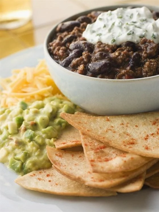 ШАГ 3 Добавьте помидоры, томатную пасту, фасоль, бульон, орегано, сахар и специи. Уменьшите огонь и тушите, помешивая, 1 час. Посолите и подавайте с тортильями и гуакамоле.
