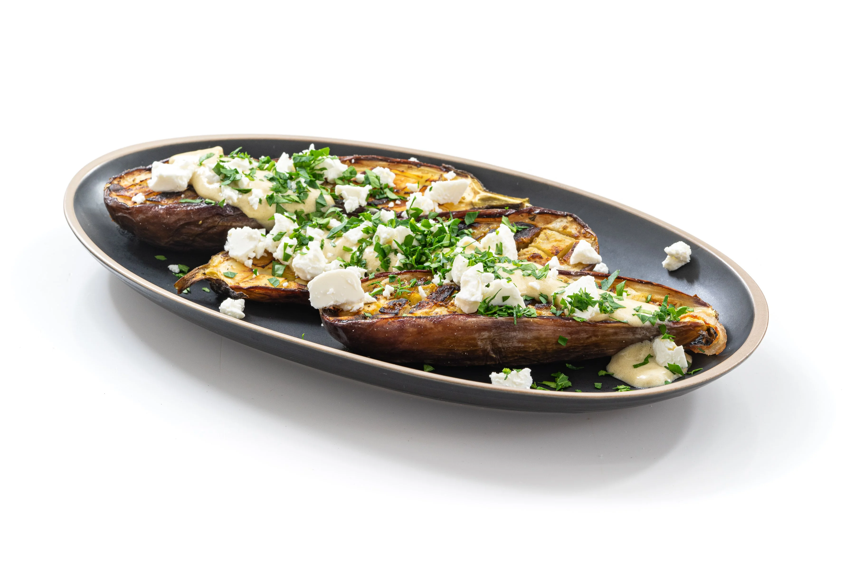ШАГ 8 Готовые баклажаны выложить на блюдо, сверху полить соусом с тахини.