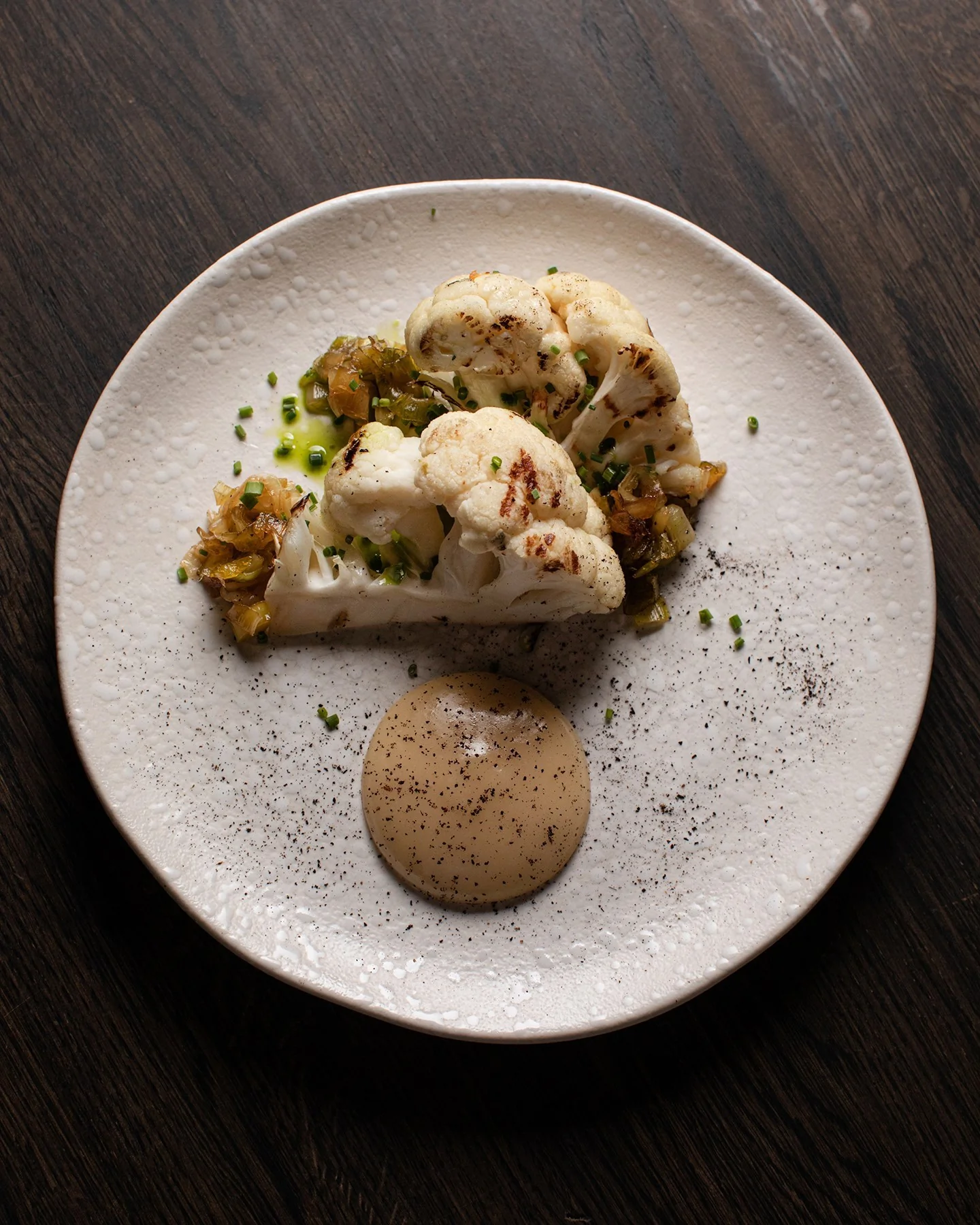 ШАГ 11 При подаче на тарелку выложить цветную капусту, рядом выложить карамелизованный лук-порей и большую ложку соуса мисо.