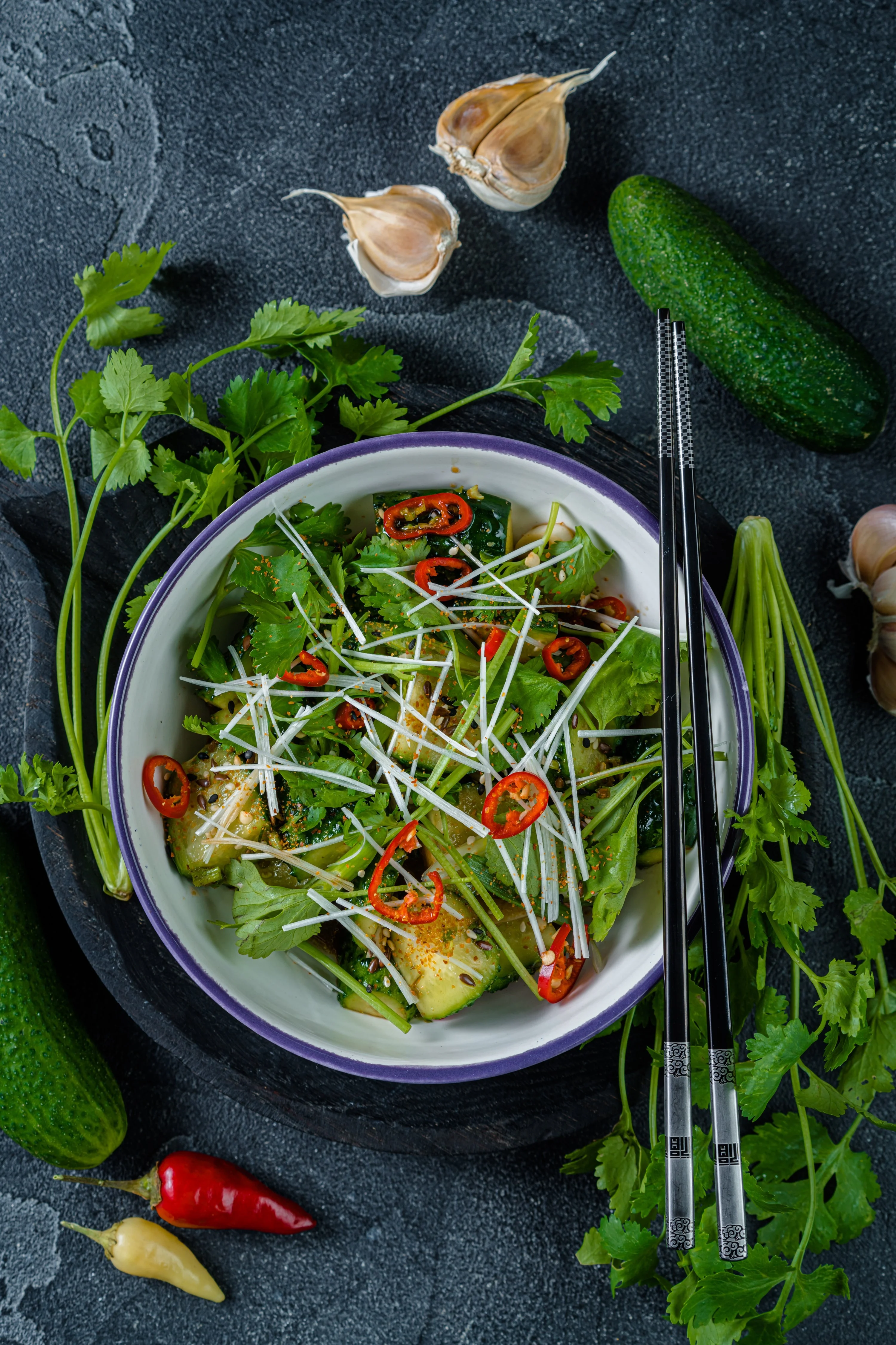 Огурцы Чеснок Перец чили Соевый соус Кунжутное масло Рисовый уксус Кинза Главная Закуски Китайская кухня
