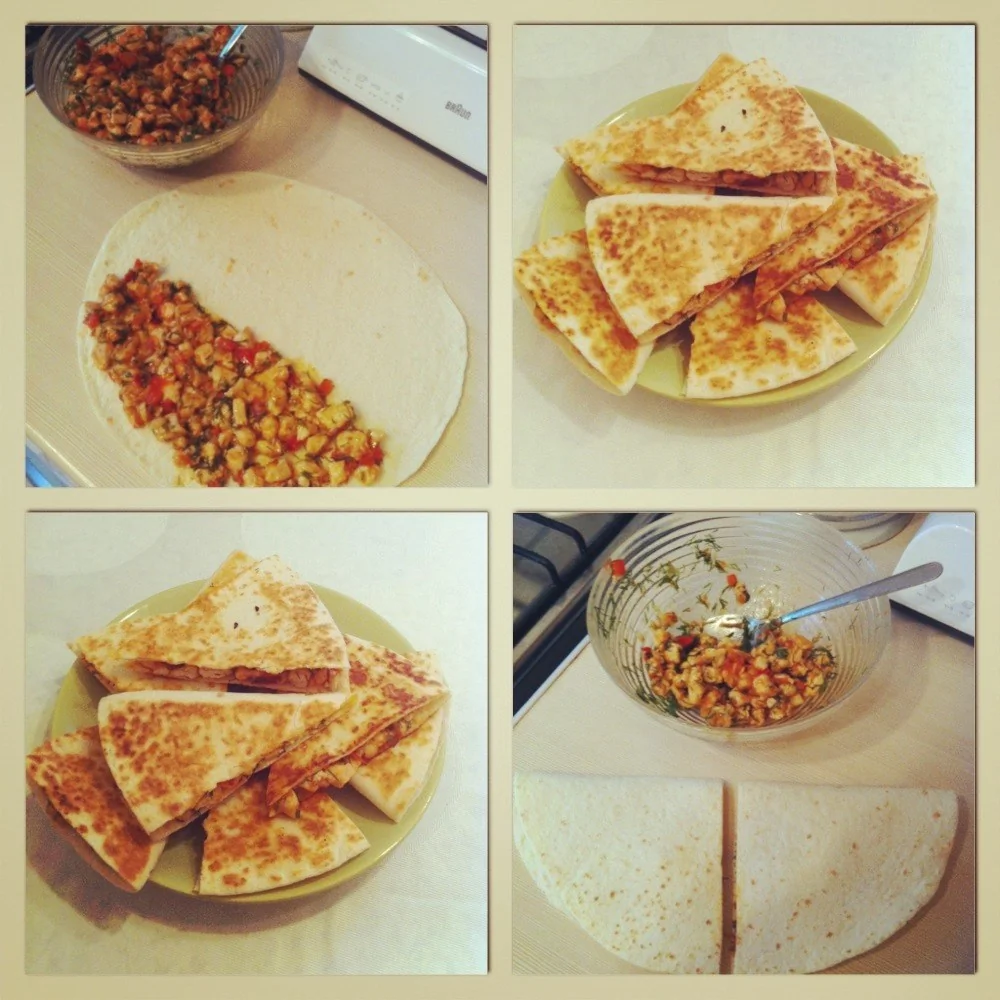 ШАГ 4 В тортилью на половину посыпать сыр, затем выложить начинку, сверху — еще слой сыра, накрыть второй половиной тортильи, разрезать пополам (как на картинке) и обжарить на сковороде или гриле в течение 2–3 минут одной стороны, затем аккуратно перевернуть и поджарить с другой стороны еще 1–2 минуты.