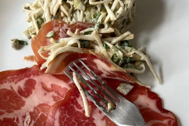 ШАГ 7 Выложить через кольцо на тарелку, рядом по краям положить сырокопченое мясо.