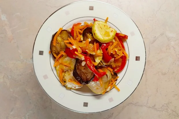 ШАГ 13 Выложить овощи слоями: кабачки, баклажаны, лук, морковь, перец. Каждый слой посолить, поперчить, посыпать чесноком.
