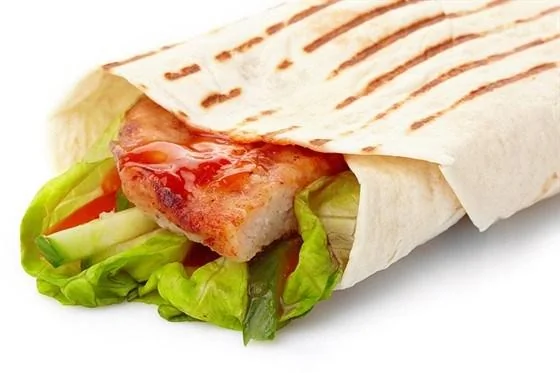 ШАГ 3 Разложите лаваши и положите по листу латука на каждый. Намажьте каждый четвертью дзадзики, затем выложите огурец, нарезанный соломкой, и затем по куску куриного филе. Заверните в рулет, закрыв только 1 конец. Перед подачей заверните в пергамент.