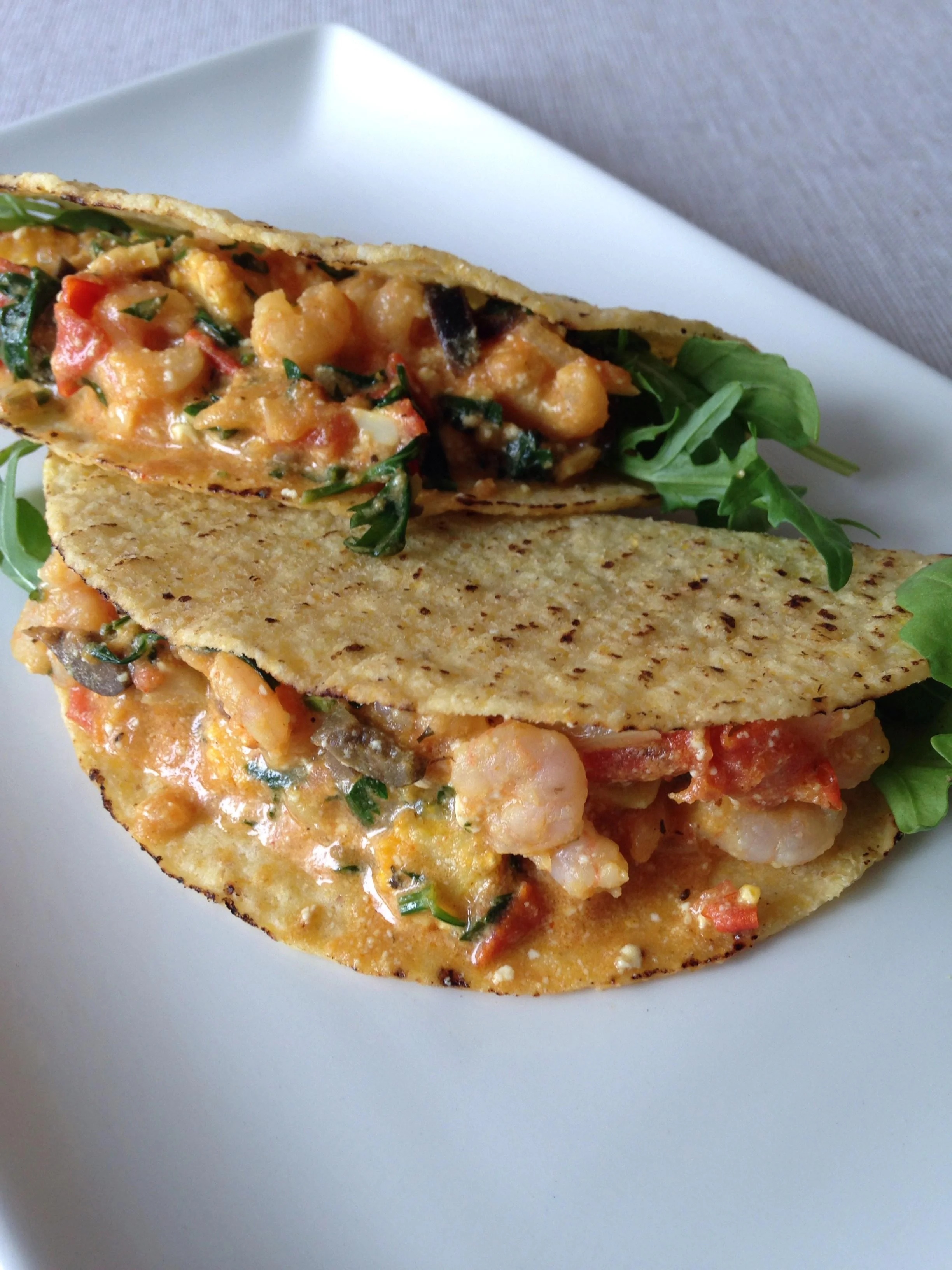 Помидоры Лепешки «Тако» Молотый перец чили Сок лайма Молотый тмин Красный лук Растительное масло Чеснок Очищенные креветки Рубленая петрушка Авокадо Салат айсберг Сметана Закуски Мексиканская кухня Такос