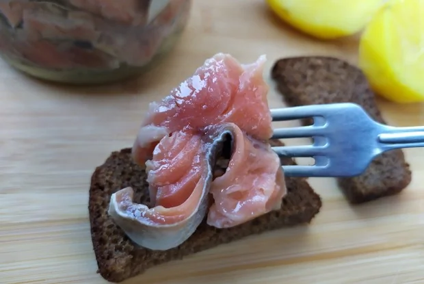 ШАГ 7 Нарезать просоленную рыбу небольшими ломтиками.