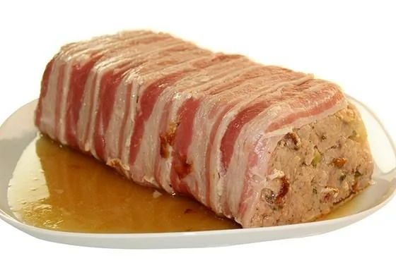 ШАГ 3 Разогрейте духовку до 150 градусов. Выложите фарш в приготовленную форму и сверху застелите оставшимся беконом. Накройте фольгой. Поставьте форму в глубокий противень и залейте на половину кипящей водой. Поставьте в духовку на 1 час. Снимите фольгу и выпекайте еще 30 минут.