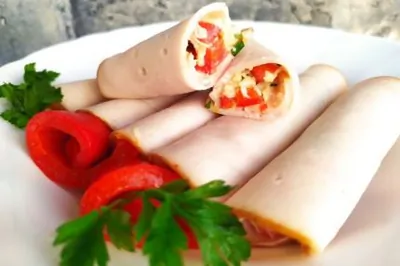 ШАГ 9 На тонкий ломтик ветчины выложить начинку и завернуть в рулетик.