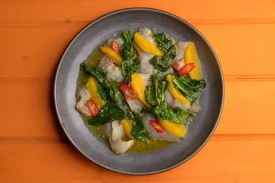 ШАГ 6 В круглую глубокую тарелку выложить кусочки филе дорадо, рядом ломтики апельсина и шпинат.