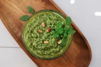 ШАГ 7 Отправить зелень в блендер, добавить чеснок и заправить маслом.