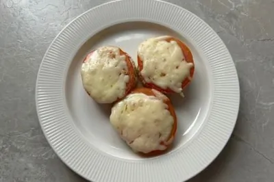 ШАГ 8 Сверху выложить нарезанный кружочками помидор и натертый сыр.