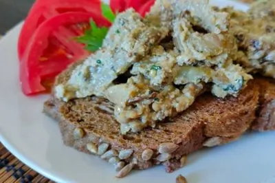 Салат из жареных на сковороде баклажан с ореховым соусом