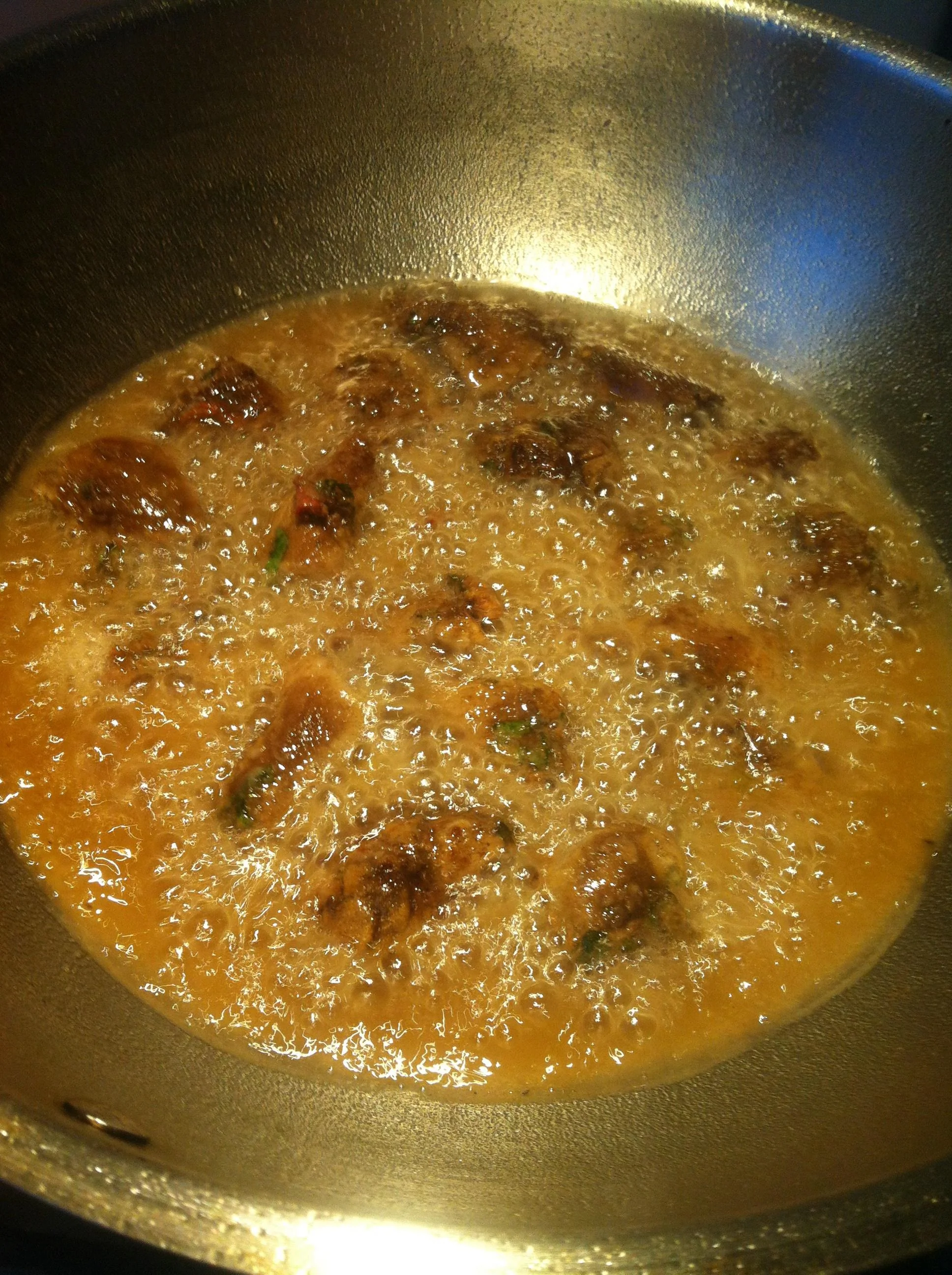 ШАГ 2 В глубокую сковороду или вок налейте масло на две-трети и поставьте на средний огонь и разогрейте до 180 градусов.