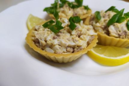 ШАГ 11 Посыпать тарталетки зеленым луком и подавать.