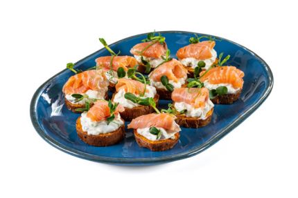ШАГ 10 Подавать канапе с бататом и лососем горячими или холодными, украсив микрозеленью.