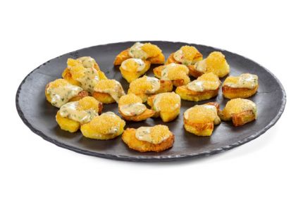 ШАГ 10 Готовый картофель обсушить на бумажных полотенцах. Далее переложить на тарелку для подачи. Выложить на каждый кусочек немного соуса и щучьей икры.