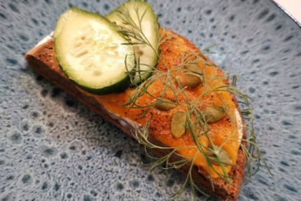 ШАГ 1 Для приготовления закусочного бутерброда отрезать ломтик черного хлеба.
