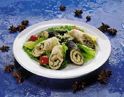 ШАГ 3 Свернуть рулеты, завязать края пленки и припустить при очень слабом кипении. Выложить на лоток, охладить, разрезать