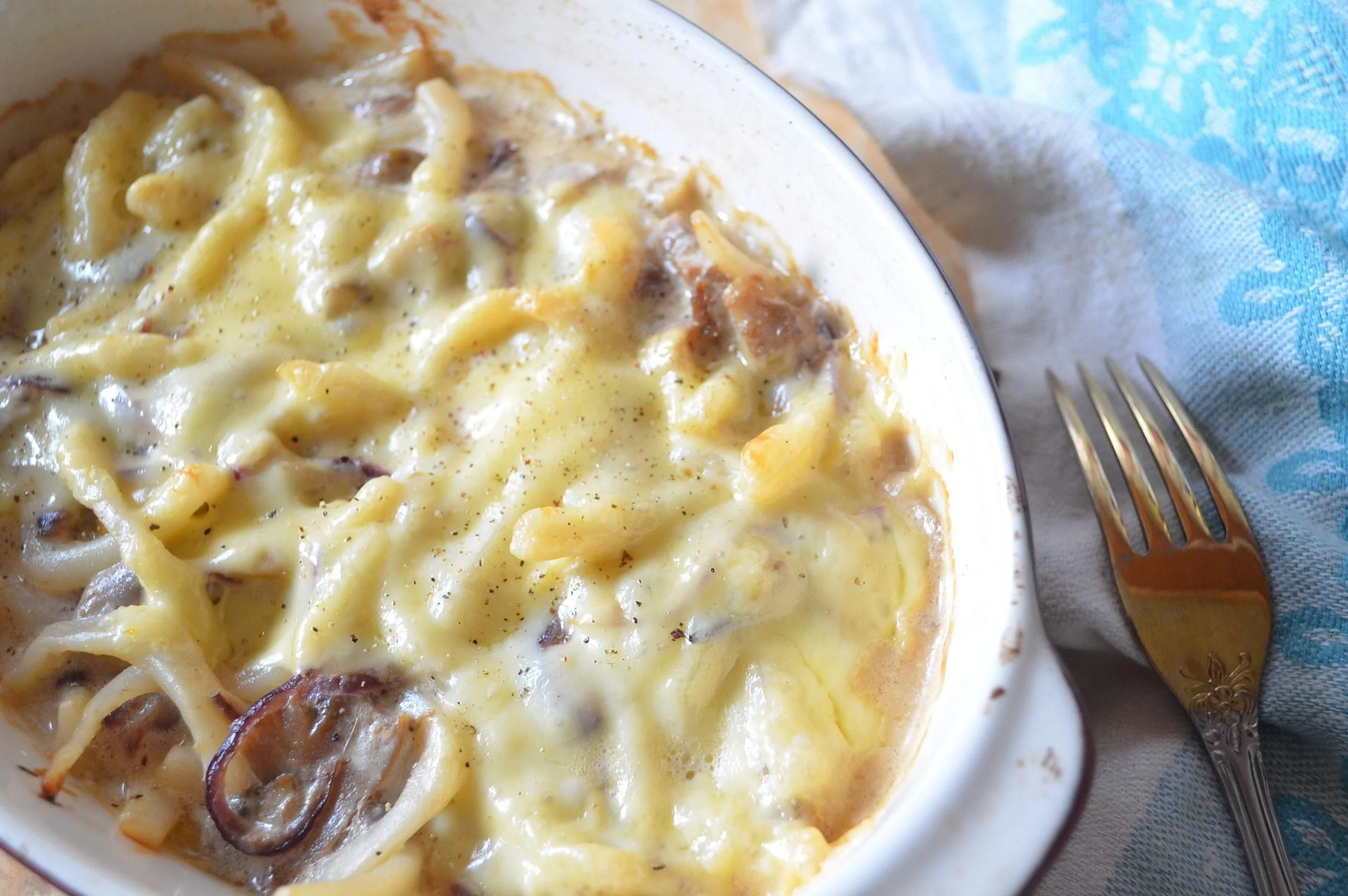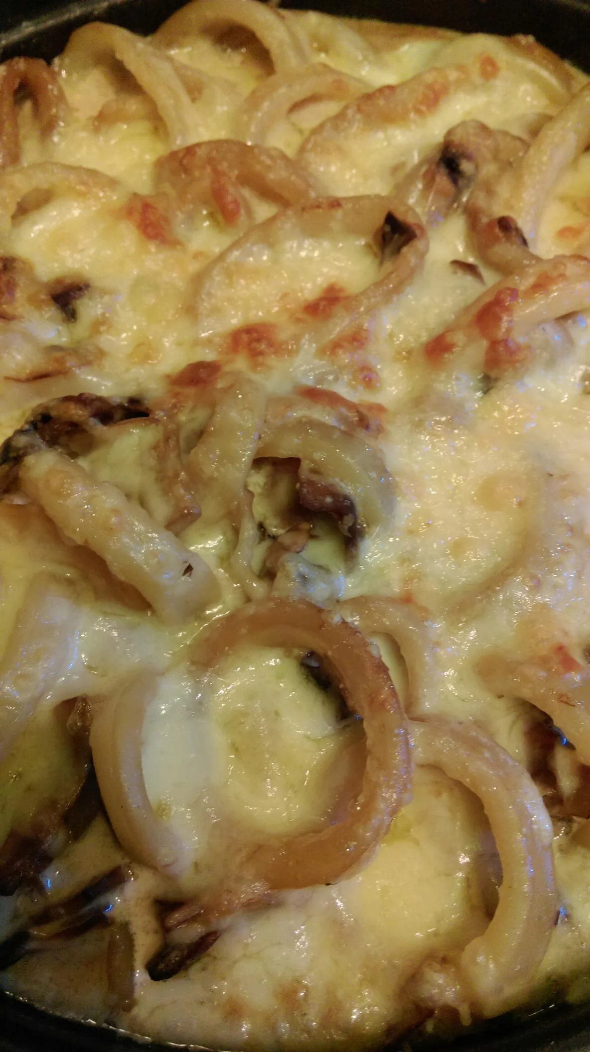 ШАГ 4 В другой сковороде разогреть небольшое количество растительного масла и обжарите кальмары примерно 1-2 минуты. Добавите лук с грибами, сметану, соль и перец. Довести до кипения и переложите в небольшие формочки или маленькие сковородки. Посыпать тертым сыром и поставить в духовку на 10 минут. Подавайте сразу.