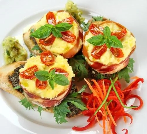 ШАГ 3 Хорошо взбейте белки и яйцо, добавьте йогурт, нарезанные маслины, розмарин, соль и перец. Разлейте смесь по чашечкам из прошутто и выпекайте 10-12 минут. Украсьте веточками розмарина.