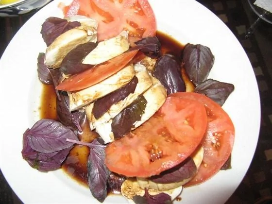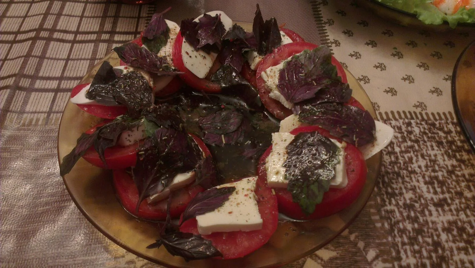 ШАГ 4 Выкладывать на тарелку по очереди помидоры, сыр и листики базилика. Сверху обильно полить соусом и подавать на стол.