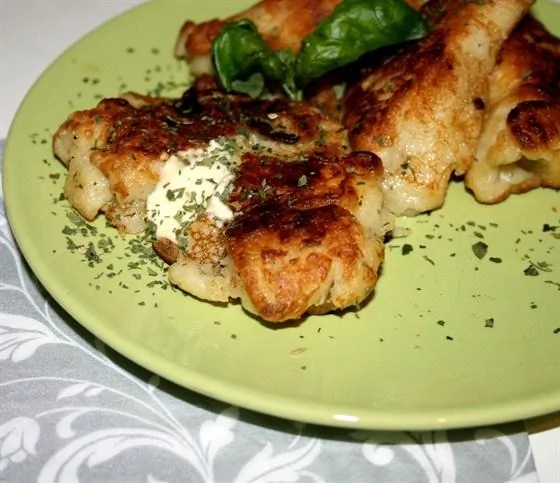 ШАГ 3 Разогреть сковороду с растительным маслом, сыр обмакнуть в кляр и поджаривать с двух сторон.