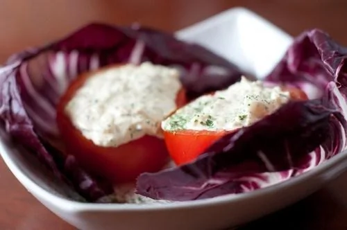 ШАГ 3 Наполните половинки помидоров массой с фетой. Сверху украсьте половинками маслин и сбрызните оливковым маслом.