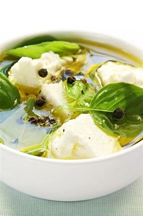ШАГ 2 Выложите козий сыр, листья свежего базилика и полейте остывшей оливковой смесью.