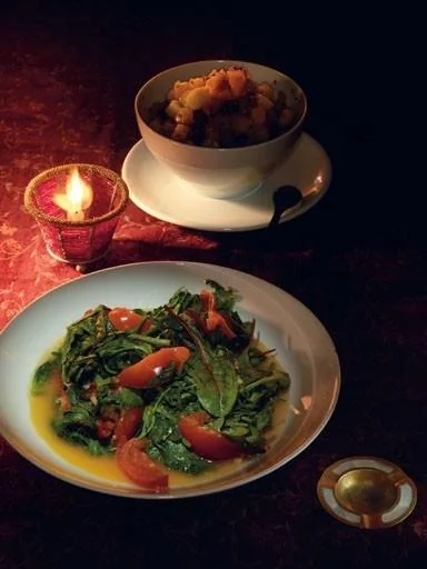 Жареная зелень с помидорами