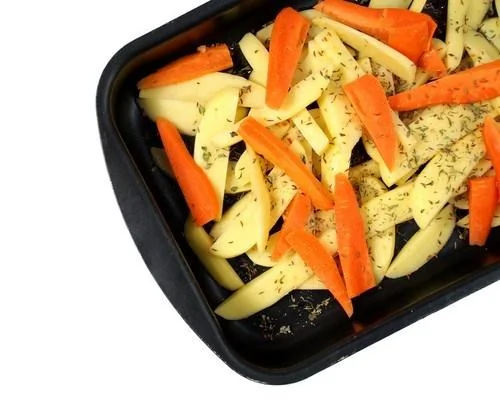 ШАГ 2 В большой миске смешайте разрезанный пополам картофель, морковь, нарезанный дольками лук и оливковое масло. Выложите в прямоугольную форму ровным слоем. Запекайте 30 минут, перемешивая каждые 15 минут, пока овощи не станут мягкими и не подрумянятся.