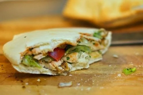 Пита с поджаренным на гриле лососем, авокадо и рукколой с соусом из васаби