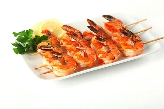 ШАГ 4 На 8 шампуров, вперемежку, наденьте по 4 дольки лимона, по 4 креветки и по 4 лавровых листа. Выложите на решетку и жарьте по 2 минуты с каждой стороны до готовности креветок.