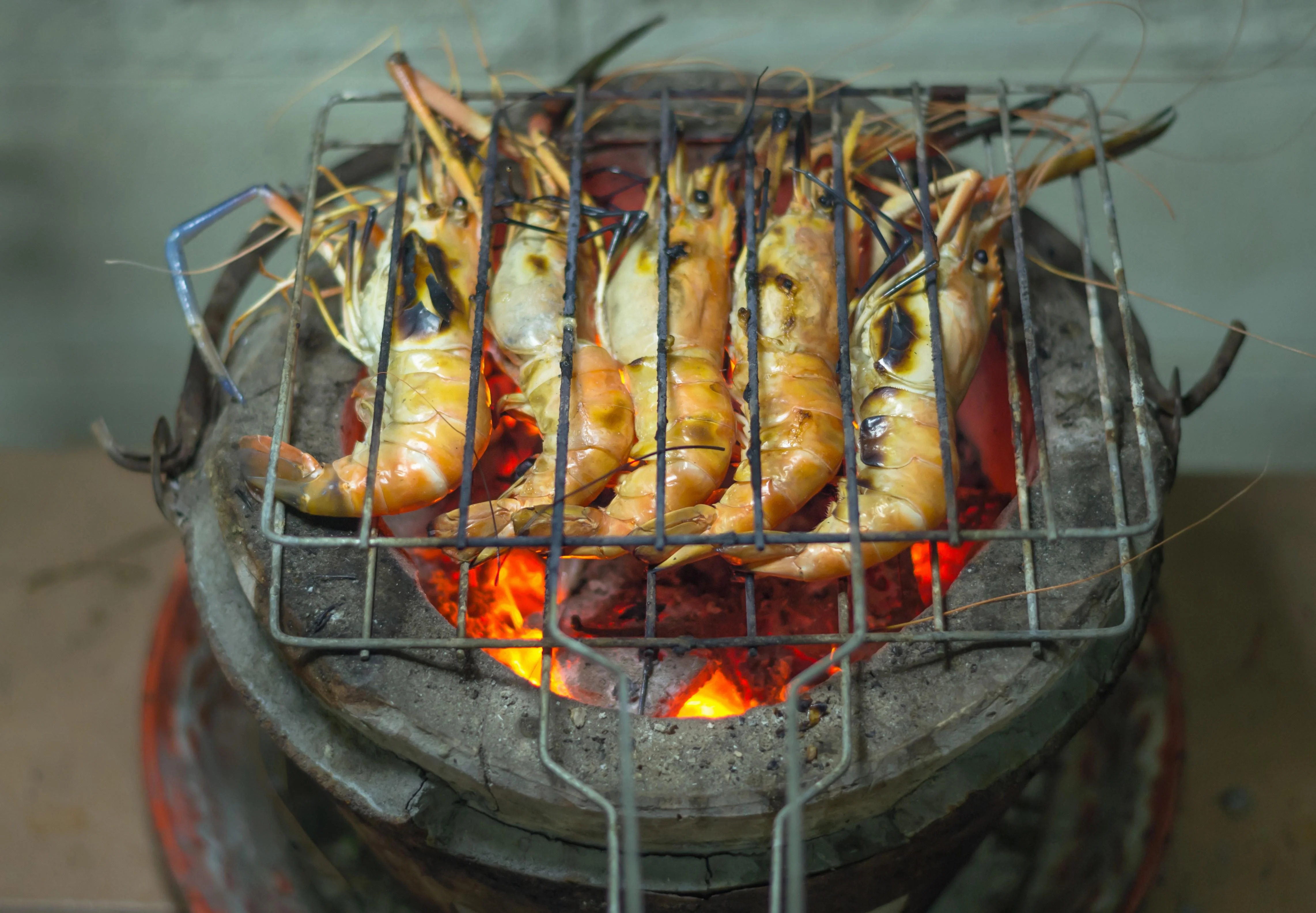 ШАГ 4 Выложите креветки на решетку и готовьте 5-6 минут, переворачивая, до готовности креветок. Подавайте с дольками лимона.