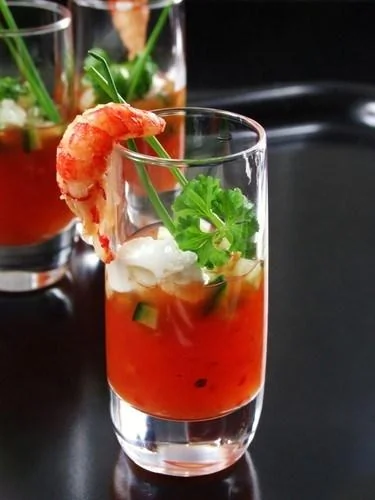 ШАГ 5 В глубокие тарелки налейте по половнику сангриты, сверху выложите креветки и нарезанные кубиками авокадо.