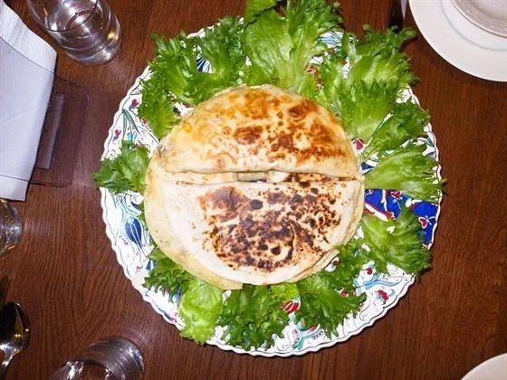 ШАГ 4 Лепешки положить на чистую сковородку, посыпать тертым сыром, сверху положить мясную смесь, сложить пополам и обжарить с двух сторон.