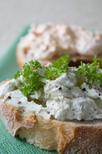 ШАГ 2 Добавьте майонез, горчицу, карри, мелко нарезанный чили и петрушки. Все хорошо перемешайте и выложите на кусочки хрустящего багета.
