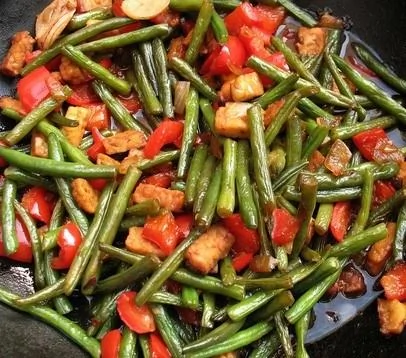 ШАГ 7 Порежьте грибы на небольшие кусочки и добавьте к луку и перцам. Затем порежьте спаржу по диагонали на небольшие кусочки и переложите к овощам. Сбрызните приготовленным чесночным винегретом и аккуратно перемешайте.