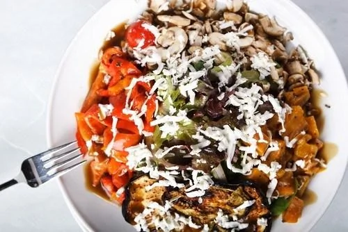 ШАГ 4 Выложите овощи и грибы на смазанную маслом решетку и жарьте примерно по 2,5-3 минуты с каждой стороны, пока овощи не станут румяные и мягкие. Переложите на блюдо и посыпьте стружкой сыра фета.
