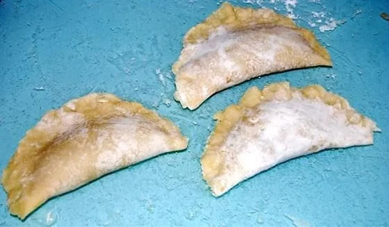 ШАГ 3 Тесто раскатать в тонкие лепешки толщиной 2–3 мм. По большому блюдцу или тарелке вырезать круги. По одной половине лепешки разровнять приблизительно 2 столовые ложки фарша, накрыть второй половиной и придавить края. Прокатить по краю специальной машинкой или краем блюдца и проверить, чтобы на шве не было щелей.