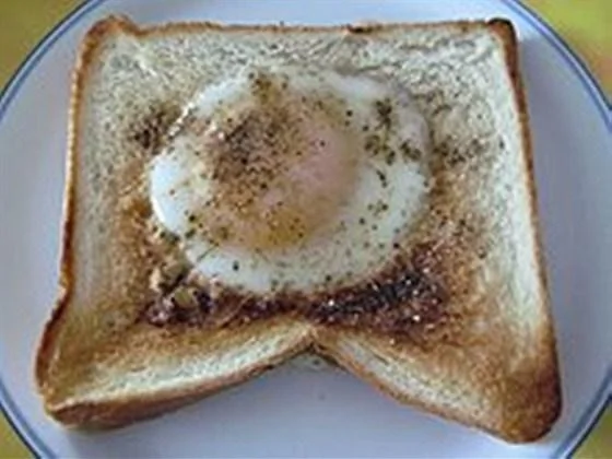 ШАГ 2 На сковороде разогреваете масло кладете хлеб (корку) и разбиваете внутрь яйцо. Солим, перчим.