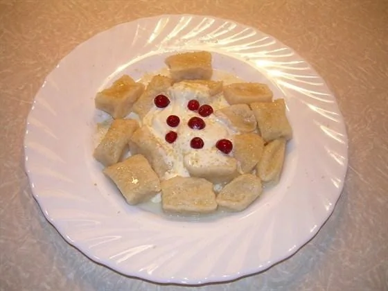 ШАГ 2 Получившееся тесто делим на несколько частей, из каждой скатываем колбаски, нарезаем на кусочки и варим в подсоленной кипящей воде 1–2 минуты. Подаем со сметаной.