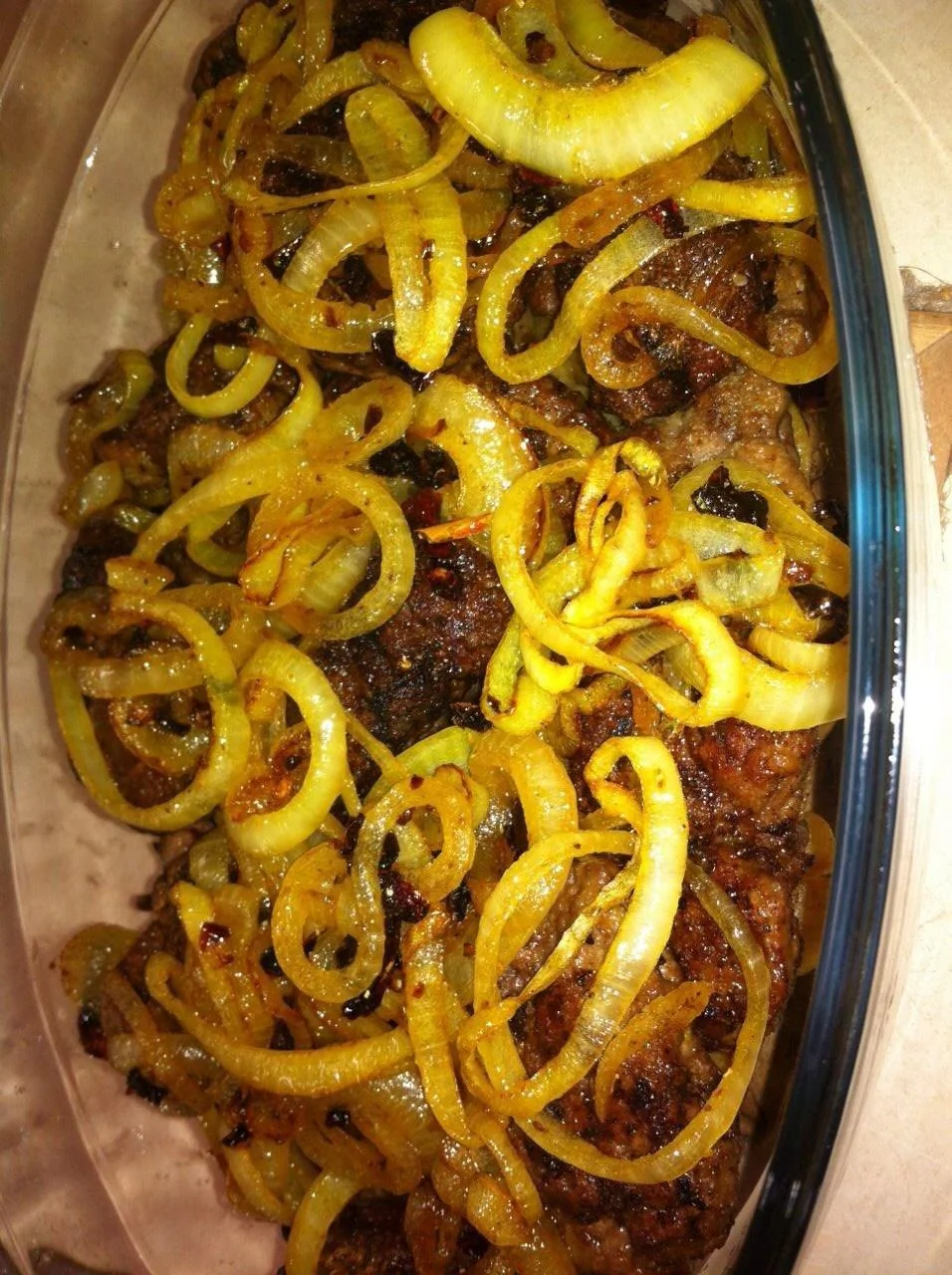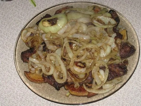ШАГ 4 Выкладываем все на блюдо в такой последовательности: яблоки, печень, лук и отправляем в СВЧ буквально на 2–3 минутки (700), можно в духовку на 5–7 минут при 175 градусах (выложить в керамическую посуду, которую можно использовать в духовом шкафу). Вынимаем и наслаждаемся.