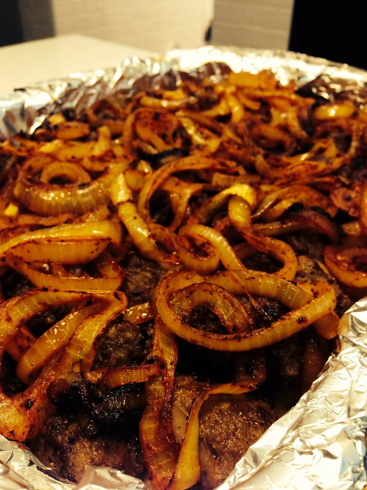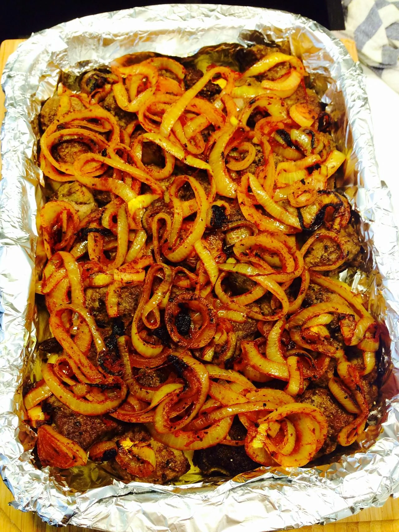ШАГ 3 Снимаем, выкладываем лук, нарезанный кольцами, солим, добавляем паприку и карри и, постоянно помешивая, жарим его до состояния, когда уйдет горечь, и он начинает становиться мягче, но еще немножко хрустит, как бы почти до готовности. Лук пропитывается уже печеночно-яблочными соками.