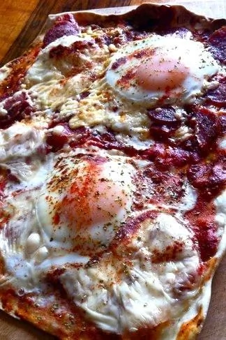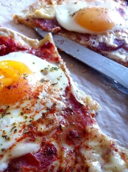 ШАГ 5 Томатный соус равномерно распределить по тесту, посыпать орегано, положить салями, посыпать сыром. Сверху влить яйца. Их можно заранее вбить в отдельные мисочки, а можно вбивать в мисочку по очереди, и аккуратно, чтобы желток не растекся, выливать на пиццу.