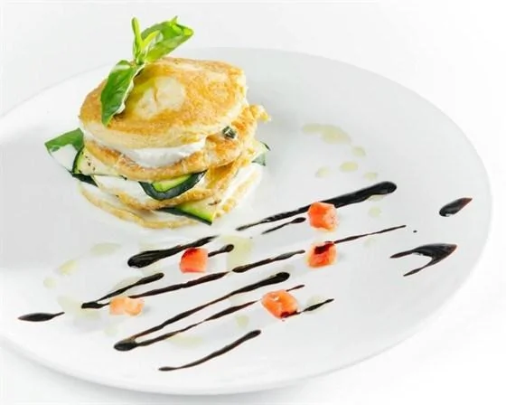 ШАГ 4 Уложите все в пирамиду. Начиная со слоя омлета, затем положите на него кружок моцареллы, полоску цукини и листочек свежего базилика. Повторяйте до тех пор, пока не закончатся все компоненты.