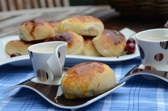 ШАГ 3 Из теста раскатать колбаски, нарезать, из полученных частей раскатать небольшие лепешки диаметром 10 см. Внутрь положить начинку, защипать по центру (как вареники). Положить на противень, швом вниз. Смазать пирожки желтком. Дать расстояться 10 минут.