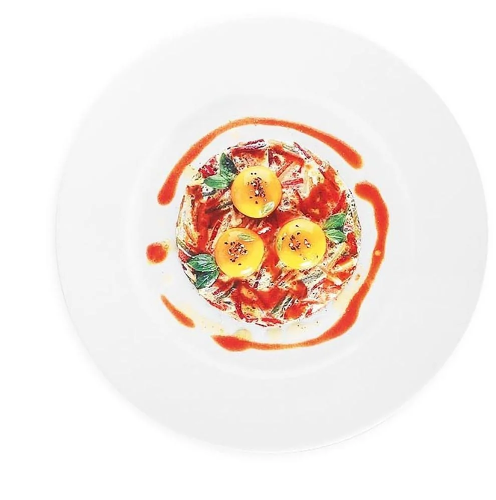 ШАГ 6 Готовый омлет смазать оливковым маслом. Каждую порцию украсить тремя сырыми желтками и базиликом, цветами соли, приправить перцем миньонет.