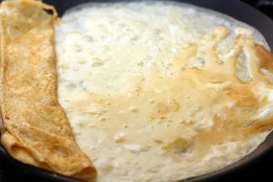 ШАГ 4 Затем сложите блинчик пополам вдоль. Сдвиньте получившийся сверток к самому краю сковороды, а на свободную часть налейте еще порцию яичной смеси. Новый блинчик должен одним краем приклеиться к первому.