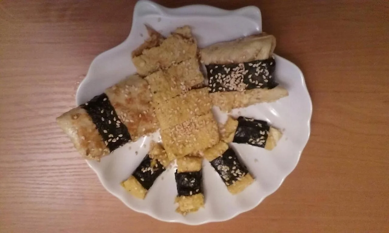 ШАГ 3 Смажьте сковороду, нагрейте ее на небольшом огне и налейте немного яичной смеси, чтобы выпечь тонкий блинчик. Когда яйца схватятся, загните два противоположных края к центру.