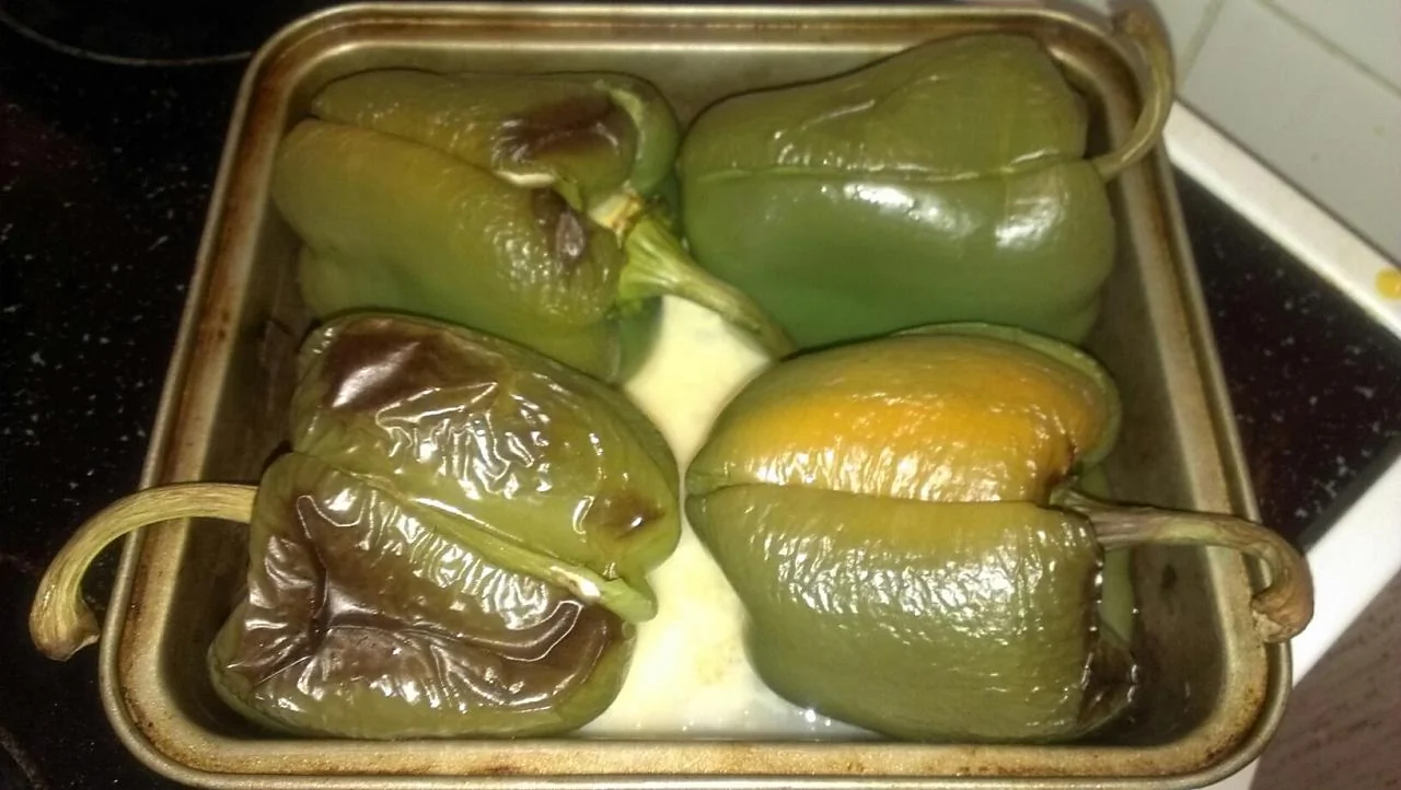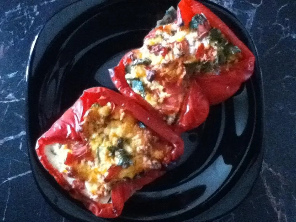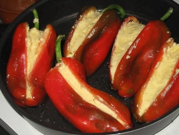 ШАГ 2 Разрезать болгарский перец пополам, очистить от плодоножки и семян. Начинить смесью.